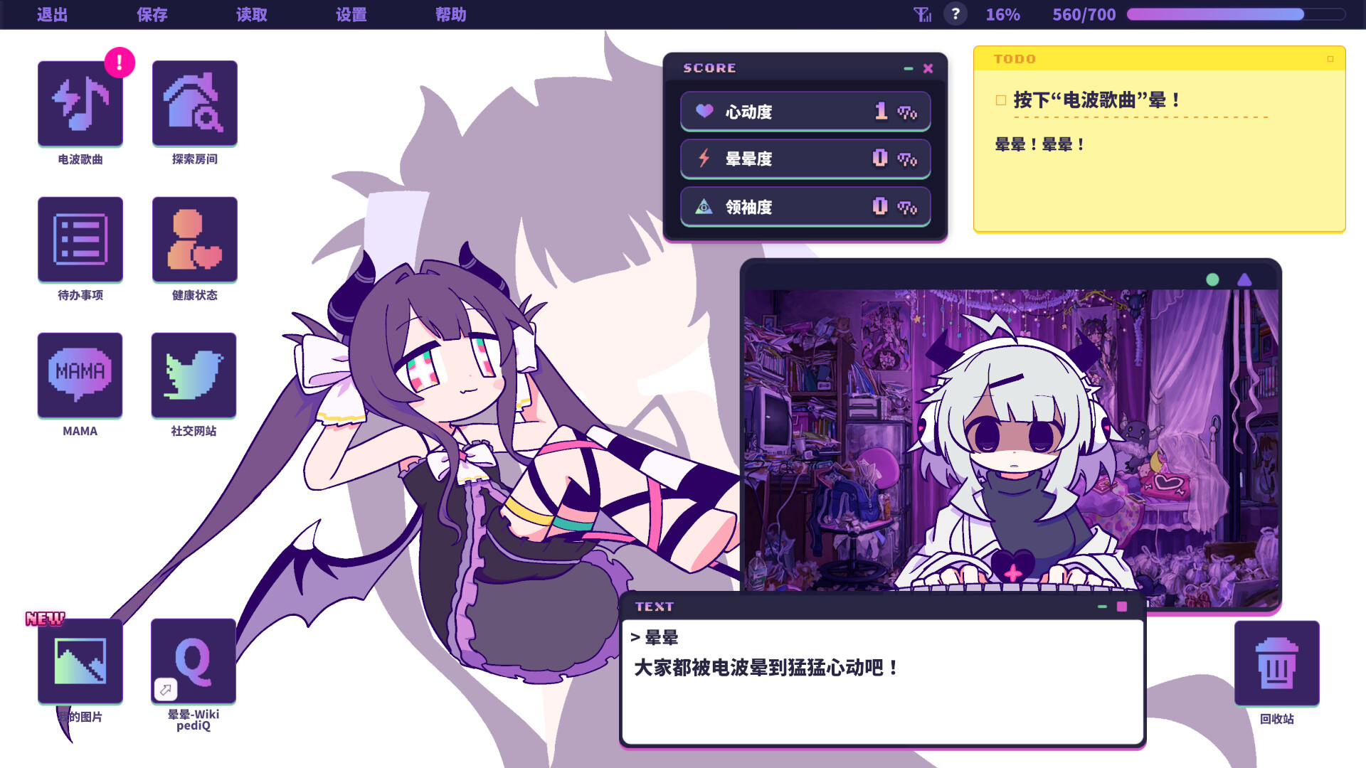 《晕晕电波症候群》是一款节奏冒险游戏。某个家里蹲少女吸食电波歌曲后上网激情输出萌萌怪文书,嗨翻天际的脑电波晃得整个世界晕头转向。 电波是死宅的看家本事!将这个狗屎世界也卷进她的电波里,变成一圈圈废料吧!